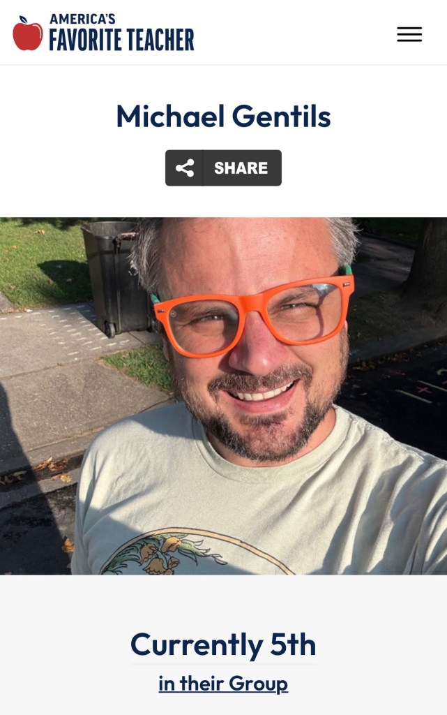 If you are interested in supporting my work, the best way to do that right now is by voting for me each day (you get 1 free vote every 24 hours) to become “America’s Favorite Teacher.”